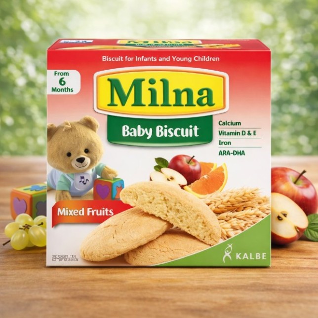 Milna Baby Biscuit Mixed Fruits 130g for 6+ months—fruit-flavored, vitamin-enriched, easy-to-soften biscuits best for healthy weaning snacks.