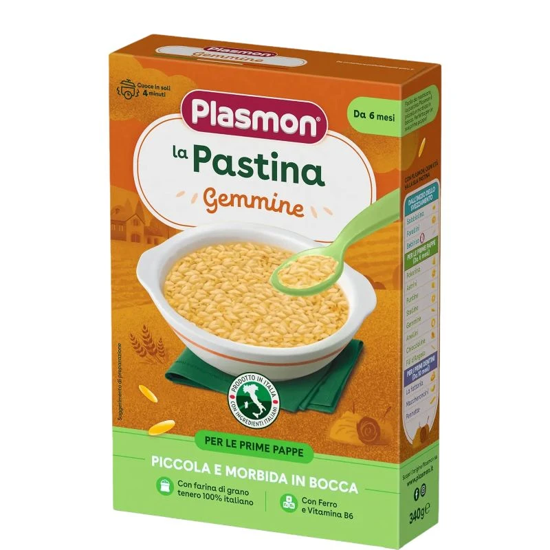 Plasmon Pastina Gemmine 300g for 6+ months—tiny gem-shaped baby pasta, soft-cooking, easy to digest, vitamin B1 enriched, ideal for early weaning meals.